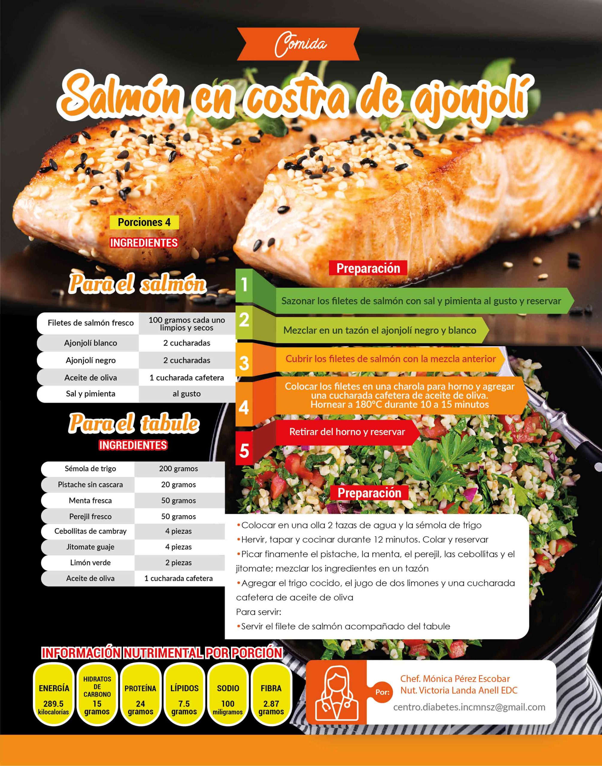 El salmón es un excelente aliado para proteger el sistema inmunológico, contiene omega 3, magnesio, fósforo, yodo, selenio, hierro, calcio, y otras vitaminas; junto con el ajonjolí son potentes antioxidantes y antiinflamatorios, haciendo de éste un excelente platillo.